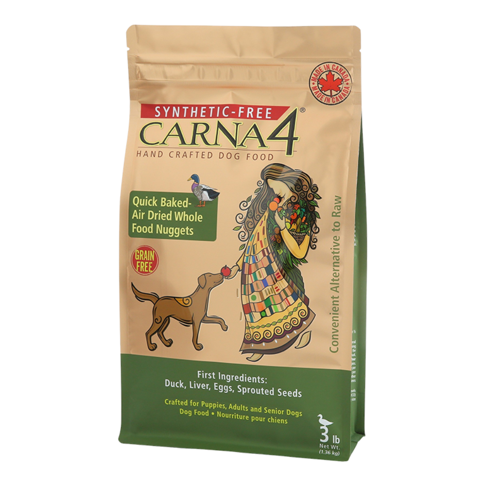 Carna4 Grain-free Duck is whole food nutrition for all life stages of your dog. Our Canadian-made pet food starts with fresh duck (we use the muscle and flesh, no by-products) from humanely-raised ducks on Quebec and Ontario farms. No meat or vegetable meals, ever. We then add pork liver, whole eggs, clean, de-boned herring, whole produce, our certified organic sprouted seeds and nutrient-rich kelp We then quick-bake & gently dry it to give your dog highly digestible vitamins and minerals, without grain or synthetic additives of any kind. No vitamin pre-mix needed, ever.