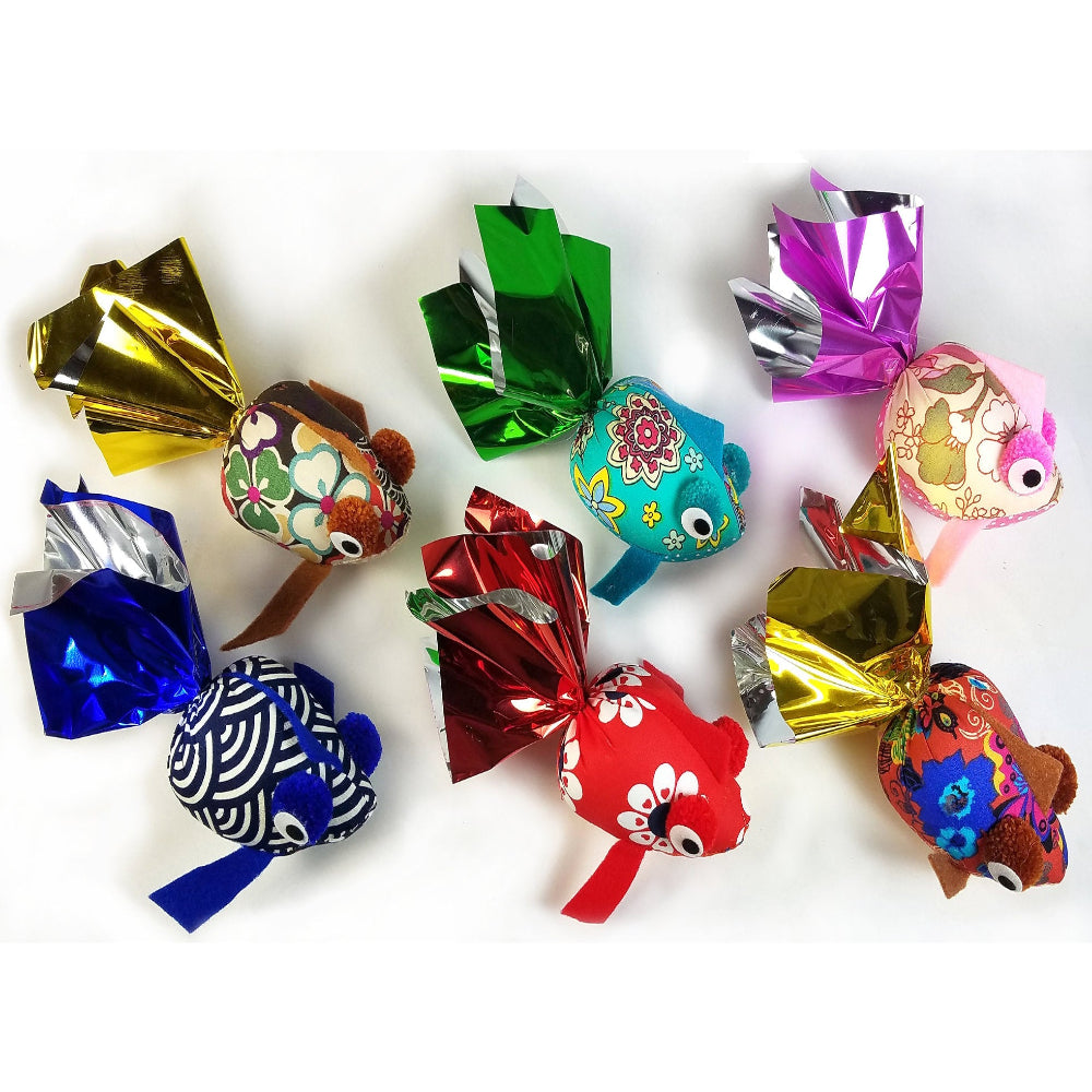 These cat toys are infused with local grown organic catnip and contain bells to make rattle sound for your kitty enjoyment. The Crink-a-fish's tail is make of mylar paper. It makes crinkling sounds as your cat play with it.