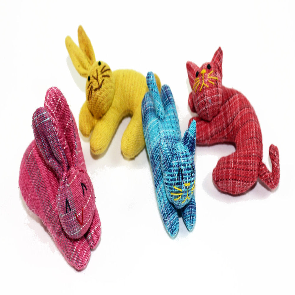 The Nip-naps & Curly cat toys are made of colorful cotton fabric and a synthetic filler. Hand-crafted, they are infused with catnip oil ( derived from USA grown catnip). Cats love them.